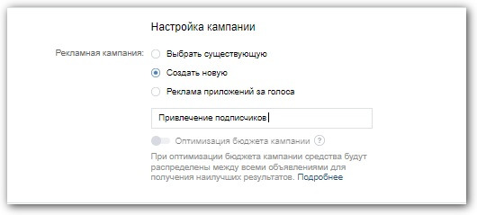 Если вы работаете с несколькими проектами или запускаете много рекламы, то кампании удобно разделять. Это поможет вам не запутаться. В пункте «Настройка кампании» выберите, где сохранится объявление: в существующей или новой.