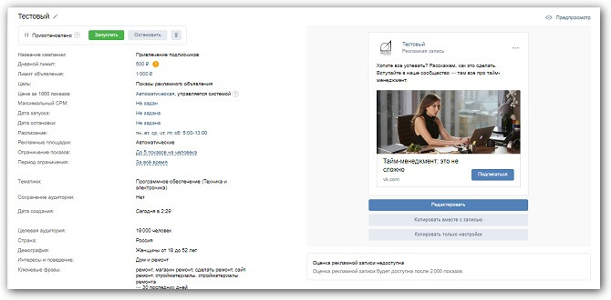 Во вкладке объявления можно проверить основные настройки и предпросмотр рекламы, задать лимит всего объявления и скорректировать дневной, поставить дату запуска и окончания рекламы, отслеживать статистику.
